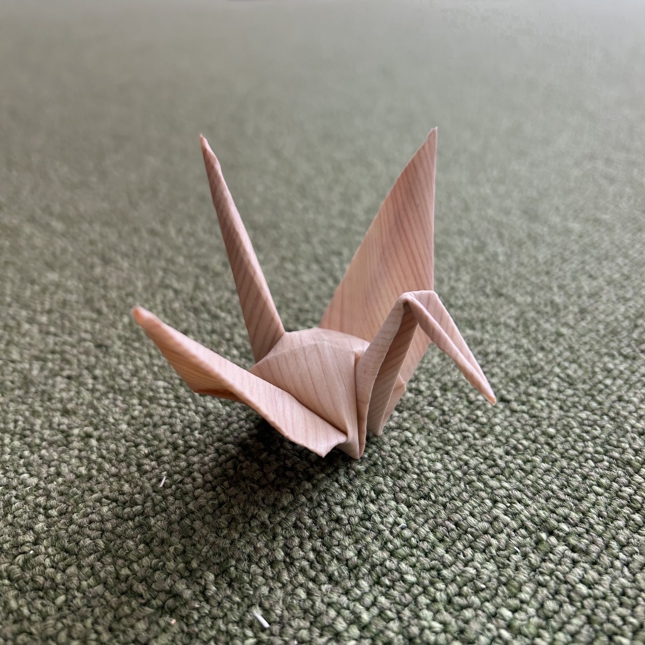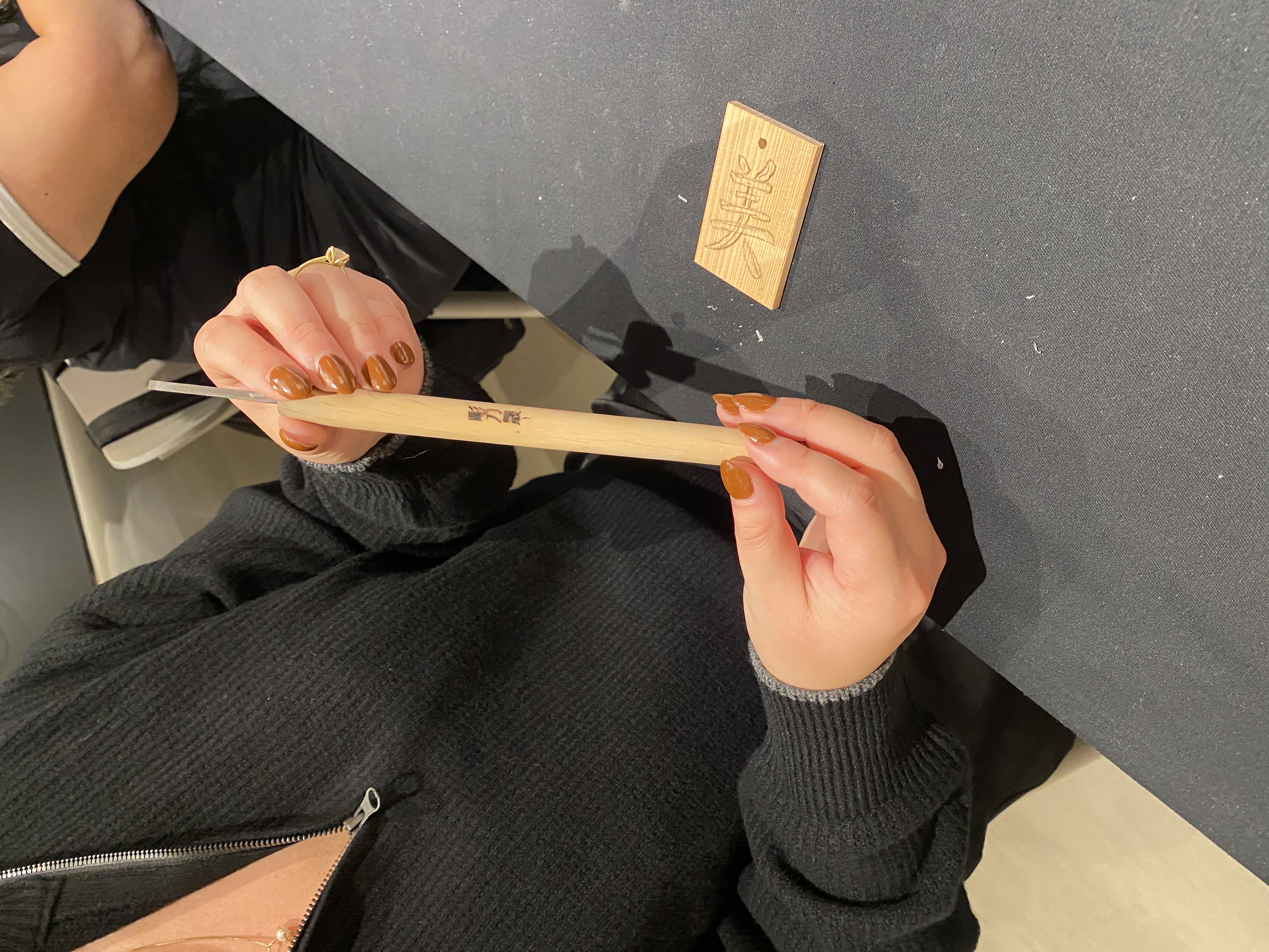 木札にお好きな文字を一字彫刻し、色付けをしていただけます。だんじり彫刻の職人が指導いたします。また、能登産の杉でできた折り紙で折り鶴を作る体験をしていただけます。